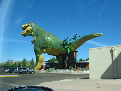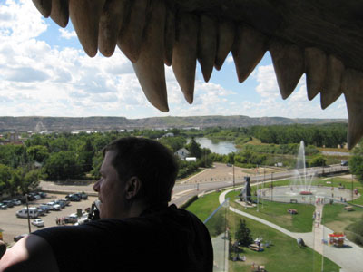When the coal-mining industry begain to fade in the 1960s and 1970s, Drumheller was smart enough to figure out a way to re-invent itself. Recognizing the importance of the fossil excavations going on at Dinosaur National Park AND the appeal it has to kids, Drumheller re-styled itself as the Dinosaur Capital of the World, with the "World's Largest Dinosaur" (above, at the information center). This dinosaur is actually a tower you can climb (for a small fee), and the view from its mouth is great! So is the climb itself (not too bad, considering the 100 or so steps), and the looks on kids' faces are indescribable.