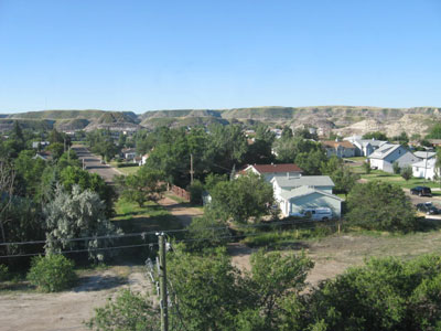 Above is a picture of the giant dinosaur from the parking lot (looking straight up from where our car was parked). At left, Tom is about to have his head snapped by the giant T-Rex teeth! The left view of residential Drumheller (with the Badlands in the distance) is from our very comfortable room at the Drumheller Ramada Inn, adjacent to an Irish pub, Boston Pizza, and a short walk from downtown. |
