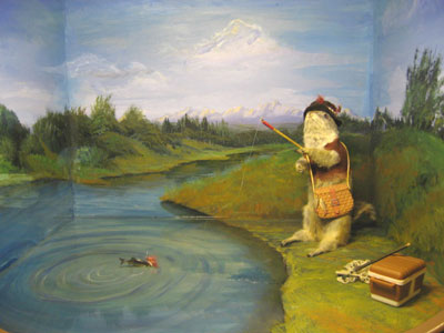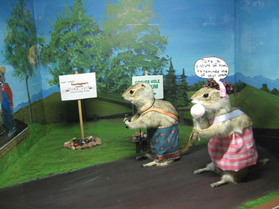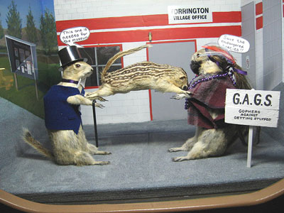 About 40 diaramas display stuffed, dressed gophers in creative settings, with appropriate captions. At left, the caption is "Take a photograph of him. He reminds me of your uncle." |