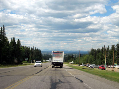 As we went back out on the road, the Rockies really were distantly visible at last, as seen from the highway in Rocky Mountain House. The flat, stretching prairie was giving away to the promise of mountains. |