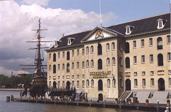 The Scheepvaart Museum (Ship Yard Museum) is housed in a grand building on the harbor. It contains a vast collection of models, reconstructions, real-life small boats, maritime paintings, and lots of paraphernalia from old ships (like china and cutlery). Adjacent to the museum are several boats maintained by the museum, including the full-size model of a Dutch East Indiaman, the Amsterdam. You can go aboard the ship and tour the cabins, the map room, the hold, and captain's quarters, and actors play the parts of actual period seamen. |