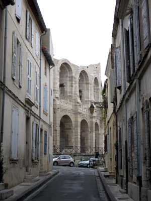 If you walked down our street, past the Arena, and down the hill, you quickly came to the Rhone. The entire embankment throughout Arles was an elevated river walk. There were a few huge ships on the river, but not many. But it was a great place to watch the sun set. (Don't ask about the dog poop....) All along the river, and throughout the city, was a variety of interesting architectural styles, shapes, designs, and colors. I loved the little votive statues on many corners.