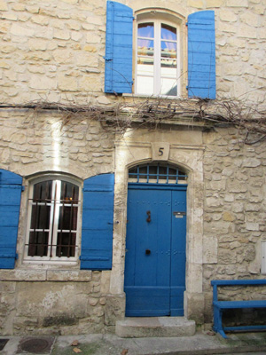 When we left the bright blue doorway of House Mireille, we were confronted by a fascinating color palette. Many house windows have colorful plants, such as our neighbor's cyclamens. The pinks and blues and greens and grays of shutters and doorways made me think I was in southern Italy, rather than France.