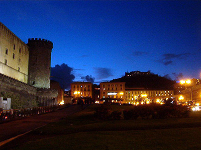 Walking toward the waterfront, we came upon Castle Nuovo, now a museum. Lit at night, it looked like a great place to find ghosts.The view from the Castle, back towards the hills that loom over Naples' historical district, was breath-taking. The waterfront was an amazing blend of heavy-duty shipping, ferries and hydrofoils, and history, such as the wonderful fountain at right. Vesuvius loomed over everything. |