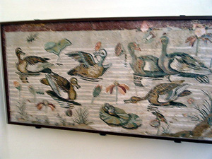 | On the first floor up the grand staircase we found the Pompeii collection, including the erotica of the "secret cabinet" (no, I didn't take any pictures of the porn), as well as wall after wall of art and mosaics. I particularly liked the duck mosaic from Pompeii. The most curious aspect of the "secret cabinet" was not the rather tame X-rated materials; it was the reaction of the visitors. We noticed that American parents left their children outside, but Italian parents (such as a delightful grandmotherly type with her 10-year-old grandaughter) took their children through the exhibit and carefully explained what the images represented! |