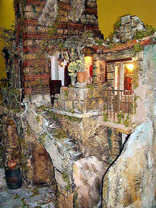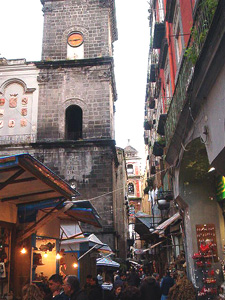 | After walking through some of the major thoroughfares of the Spaccanapoli district, we turned down one of the side streets near a church bell tower, and discovered we had stumbled into the street market of Christmas creches (nativity scenes). Apparently this is a big folk art in Naples, and people design extravagant scenes for display throughout the holiday season. The size and detail of many of the scenes was amazing, as shown in the below photos; they really are folk art.
