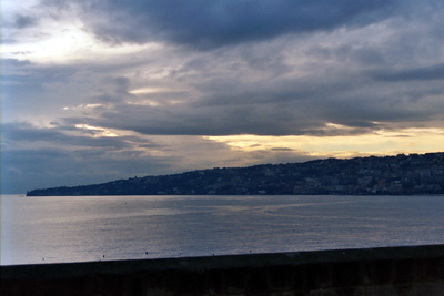| While waiting for the ferry, we had an hour to kill, so we decided to walk down the waterfront to Castle dell'Ovo and check it out. Below are views looking out toward the Isle of Capri (left photo) and views from the top of the Castle looking toward Mergelina and the residential area of Naples (right photo). | |