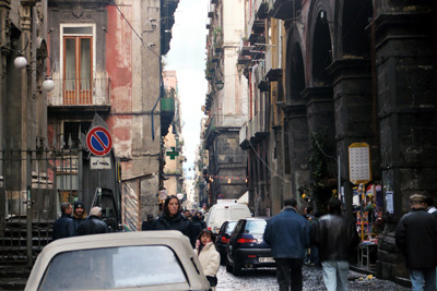 | After Piazza Dante, we turned down one of the old, narrow main streets crowded with people, cars, scooters, and goods for sale. The array of human confusion was dazzling! |