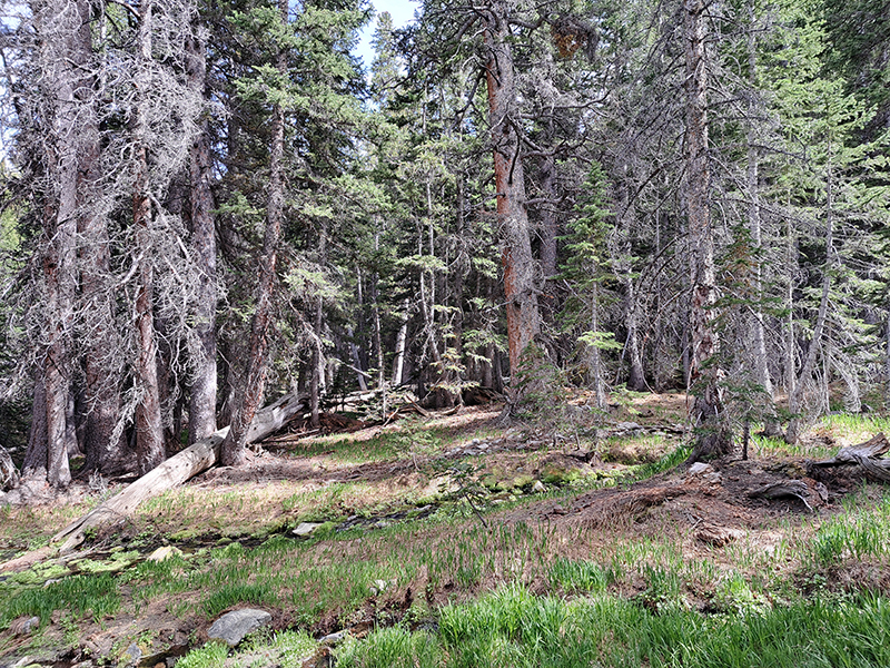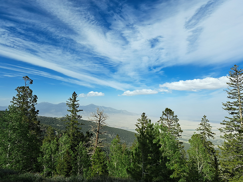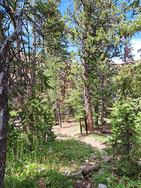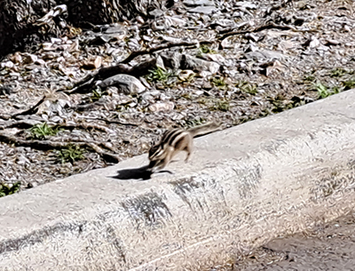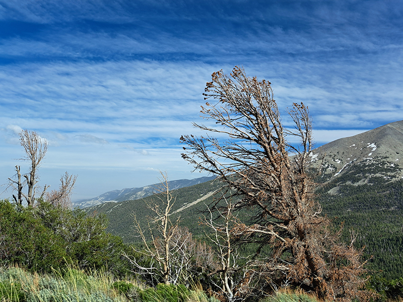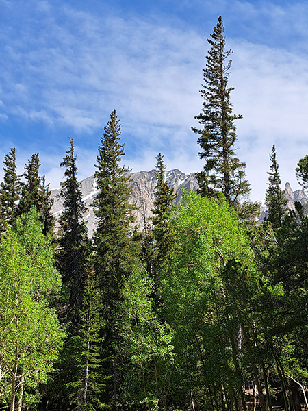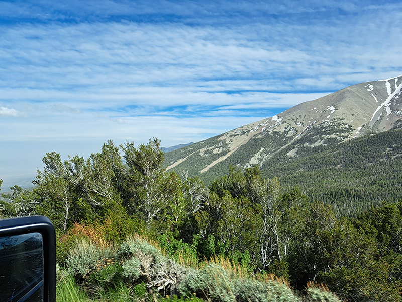 After getting our questions answered at the Visitor Center, we went back to the Jeep and headed out for the Wheeler Peak Scenic Drive. You should understand one thing: I don't like heights, particularly HIGH heights. This was a very narrow road without guard rails, looking down and out on incredible scenery that I wanted to see, but that I didn't want to look at. Fortunately, there were occasional scenic pull-offs where I could get my feet on the ground, which made looking out more tolerable. A short way up the drive, we stopped by the Osceola Ditch Trailhead. We walked a little distance and discussed taking this trail, which could be a short 1 mile walk or a much longer 9 mile walk, through an area originally constructed to convey water for mining gold. It was quite pretty, considered a prime example of montane flora and fauna, but we opted to continue the ride up the mountain. The views were stunning, and the scenic overlooks were well positioned. The photo (below left) was at one of my favorite overlooks, the Mather Overlook. But we kept on driving up and up until we finally reached the Wheeler Peak Overlook, and then ultimately the Wheeler Peak Campground, which was the access point for several additional trailheads. On this Monday afternoon in the park, we kept it simple and just walked around the ADA-accessible Sky Island Forest Trail. This was a fairly flat, well-groomed walk (much of it on a board walk), providing an introduction with interpretive signs to the plants and animals at this level of the mountain. Tom made notes for a return hike on Tuesday, where he would tackle the Alpine Lakes Loop (while I bird-watched at the lower level!). |