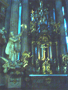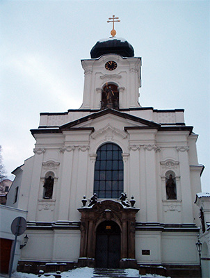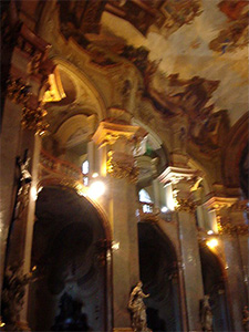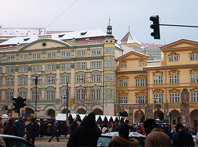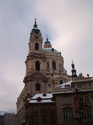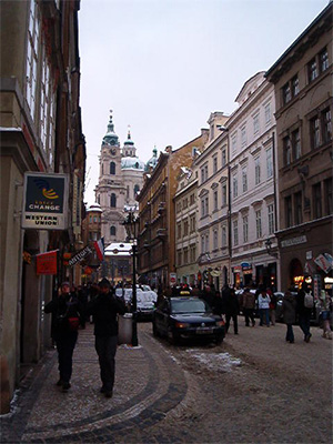 | Each day, we would walk down Triziste Street and turn the corner toward Malostranske Namesti (Mala Strana Square). The center of the square is the St. Nicholas Church, billed as the most beautiful church in Prague. Its elegant dome and towering spire are visible throughout the city. | |