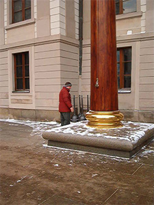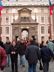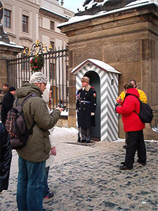 The main courtyard led to a historic gate that was part of the oldest structure on the castle. In front of the gate are the honor guards, who seemed to be the most popular photographic target of tourists. (I was not quite as interested when I learned they were a modern addition, added in about 1989 to appeal to tourists.) Tom was bemused (and not pleased) by the massive pin-shaped flag poles; they seemed out of place and too modern. |