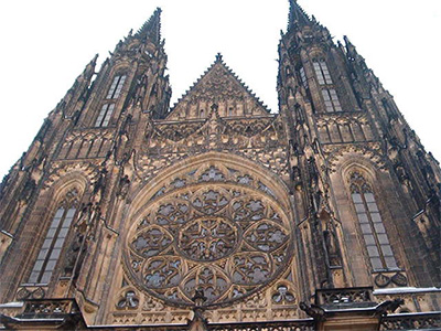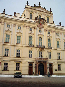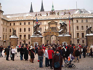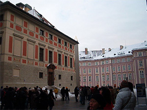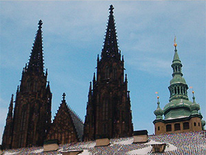 The purple building in the background is the current home of government of the Czech Republic (the president's home and offices). As one entered the second courtyard, there was a very dark passage which led to an astounding view of the towers of St. Vitus Cathedral, towering over the roof lines of the castle. |