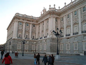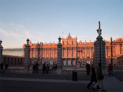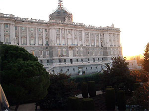 | Walking back from the Temple, we found ourselves strolling through the baroque Sabattini Gardens of the Palacio Real. It was getting close to sunset, so pardon the dark pictures. The palace was a giant sprawling hunk of limestone; it appeared to be undergoing some restoration (note the scaffolding on the dome). |