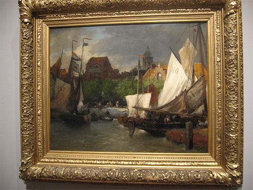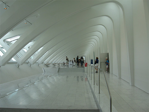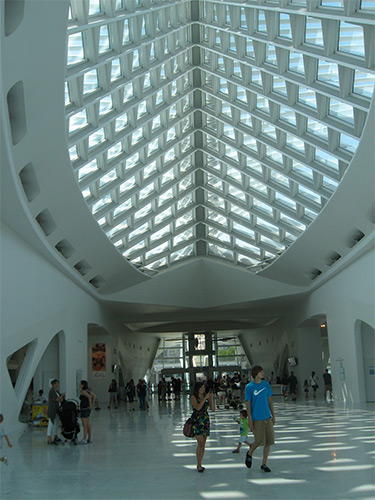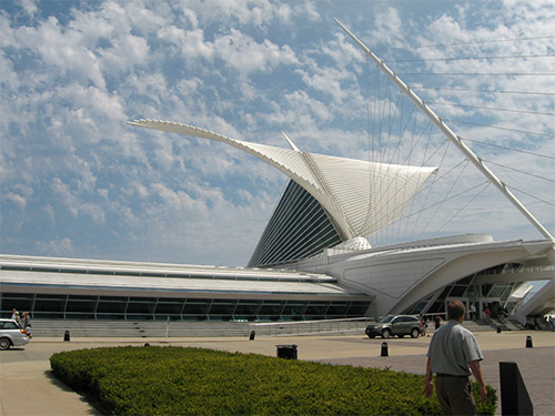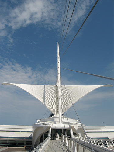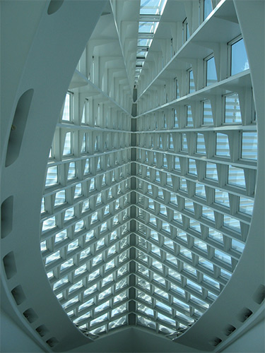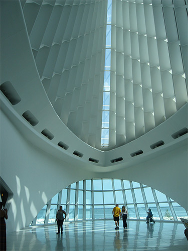 What an amazing design for the Milwaukee Art Museum (MAM), by the architect Santiago Calatrava.... Shaped somewhat like a boat, with a raised sail that opens and closes like wings, this is a wonderful space. The grand entry hall (photos below) is breath-taking, and even the hallways to the art galleries have a cool serenity. The art collection is also nice, thankfully. There is a good representation of Georgia O'Keefe, and I particularly enjoyed gallery 14, devoted to the "School of the Eight" (which I had never heard of). I really liked the art of Robert Henri, "leader" of this group. |