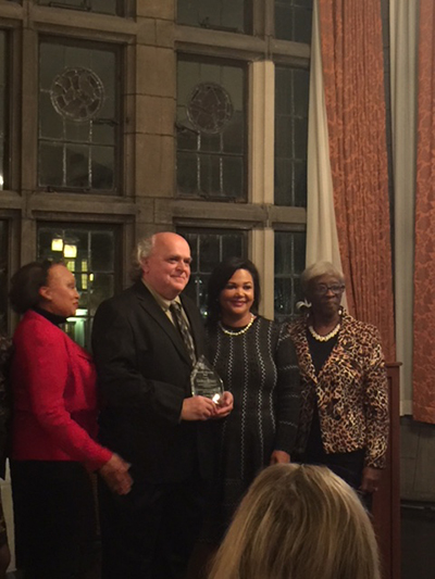 Dec 4, 2017. Rumsey receives the South East Chicago Commission "Community Stakeholders Award," in recognition of outstanding service to the community. From left, Elizabeth Garden (event chair), Rumsey, Wendy Walker Williams (SECC executive director), and Shirley Newsome (president of the SECC board).